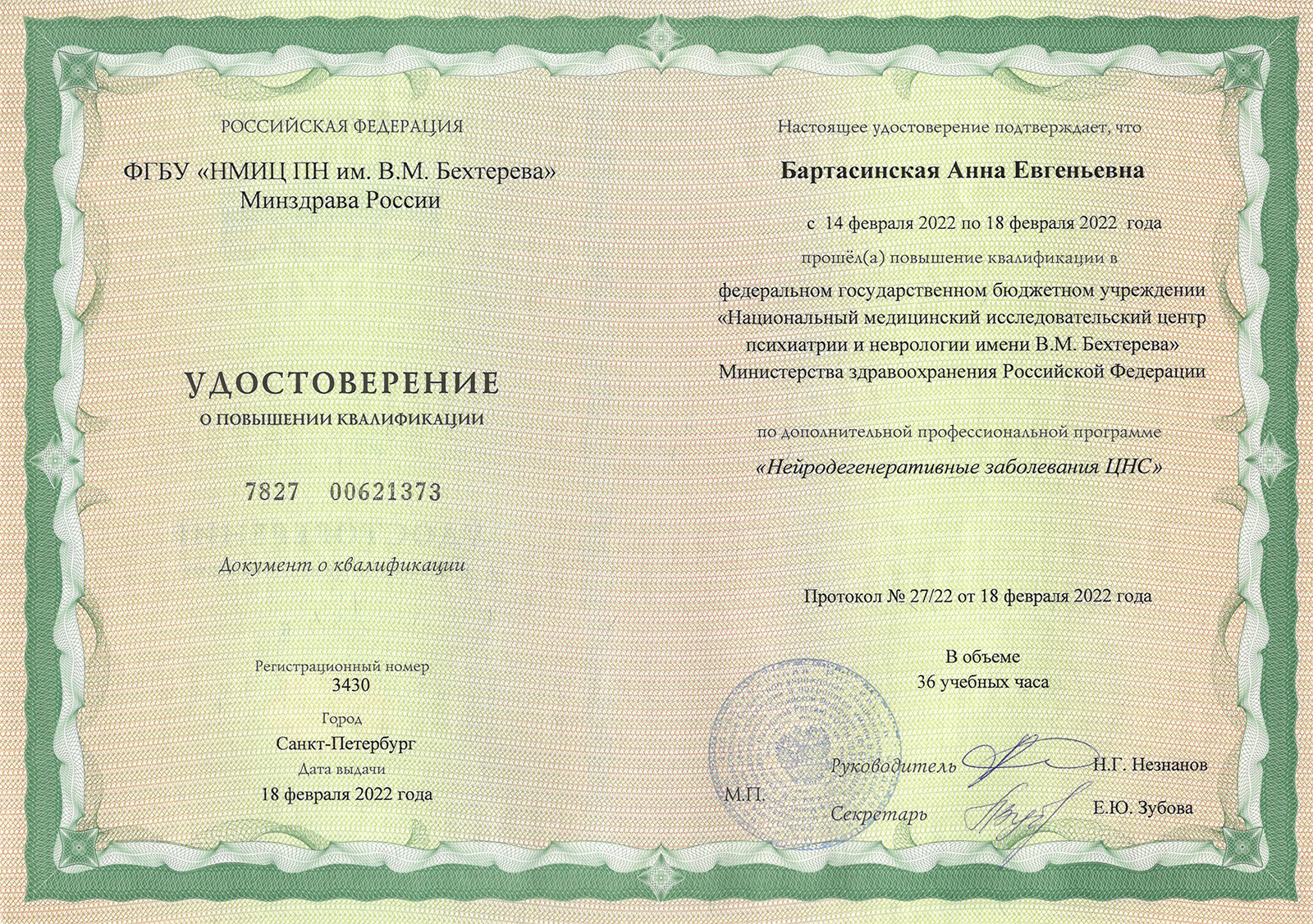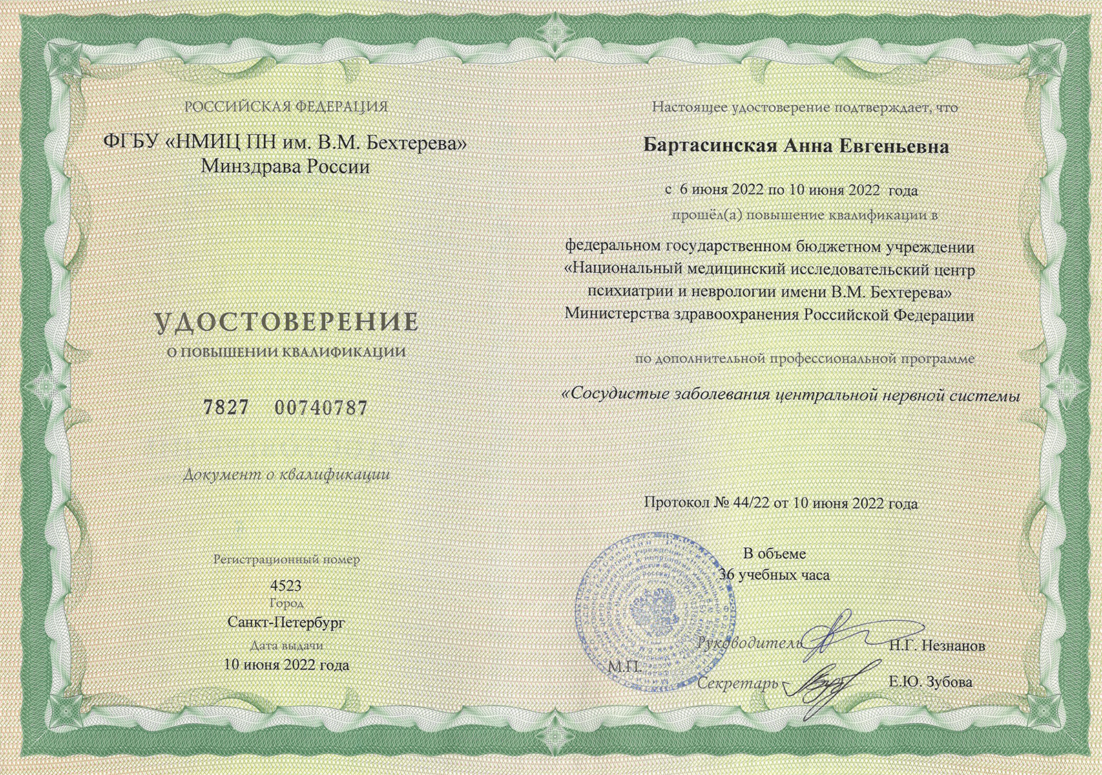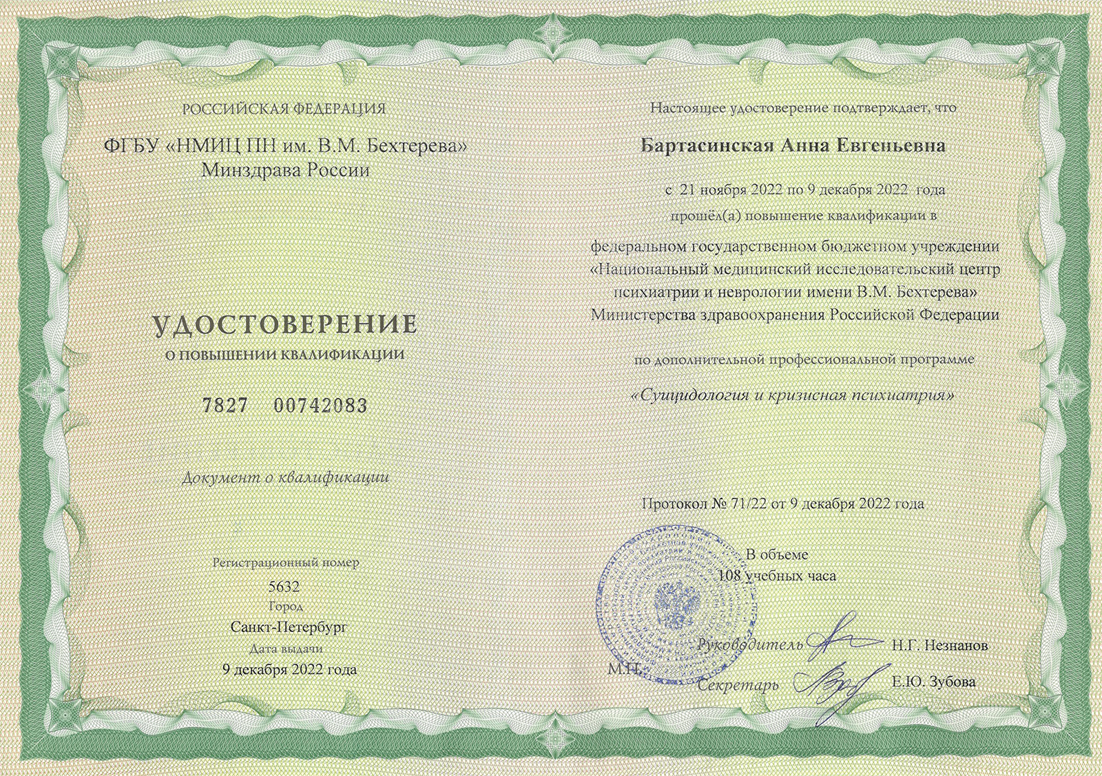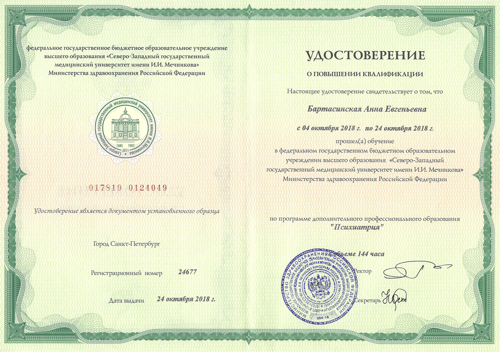 Бартасинская Анна Евгеньевна уделяет внимание психообразованию пациентов, подробно разъясняет особенности заболевания, этапы и прогноз терапии. Считает важным формирование у пациента осознанного отношения к терапии и соблюдение рекомендаций специалиста. Регулярно повышает квалификацию, участвует в профессиональных конференциях, семинарах и обучающих программах, совершенствуя свои знания в области психиатрии смежных дисциплин.