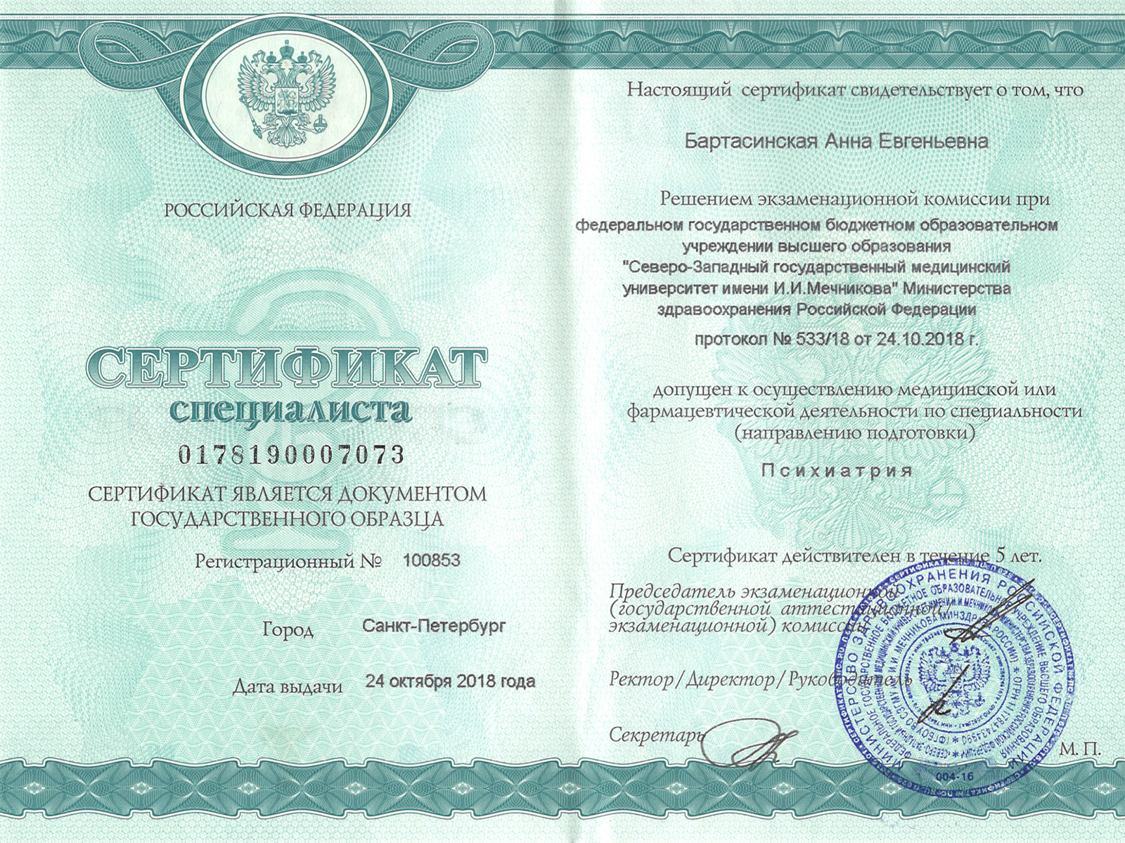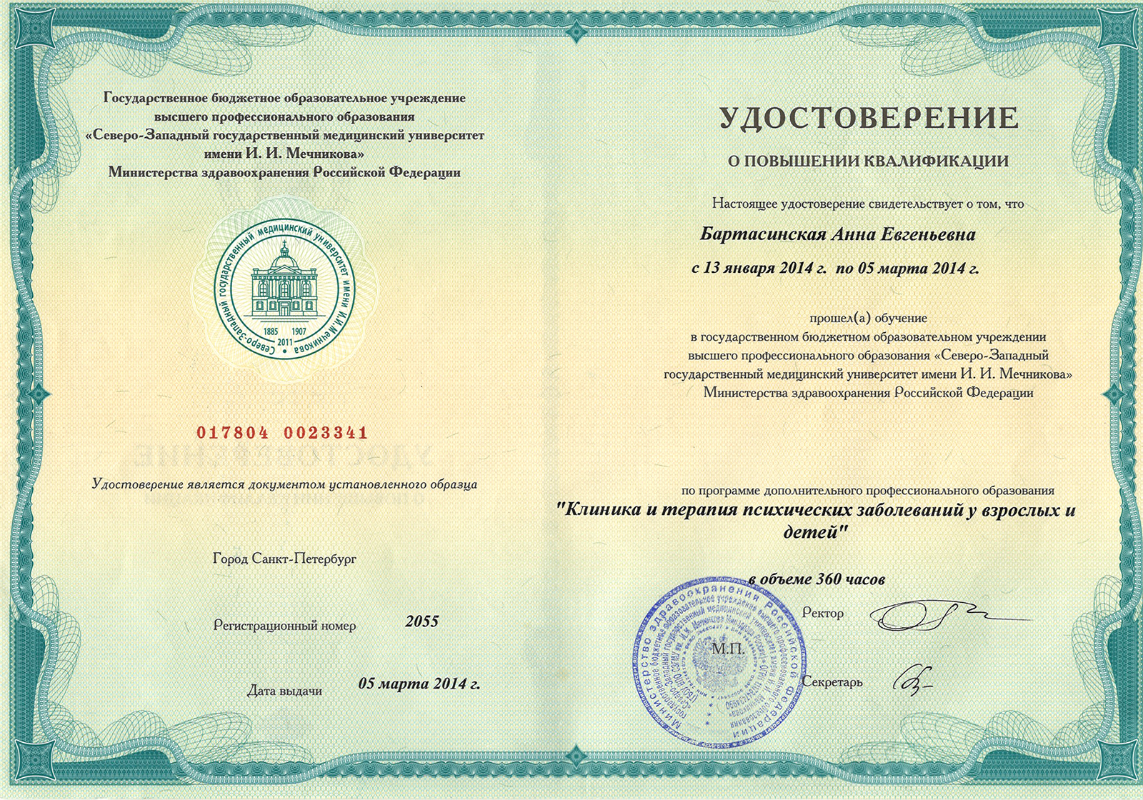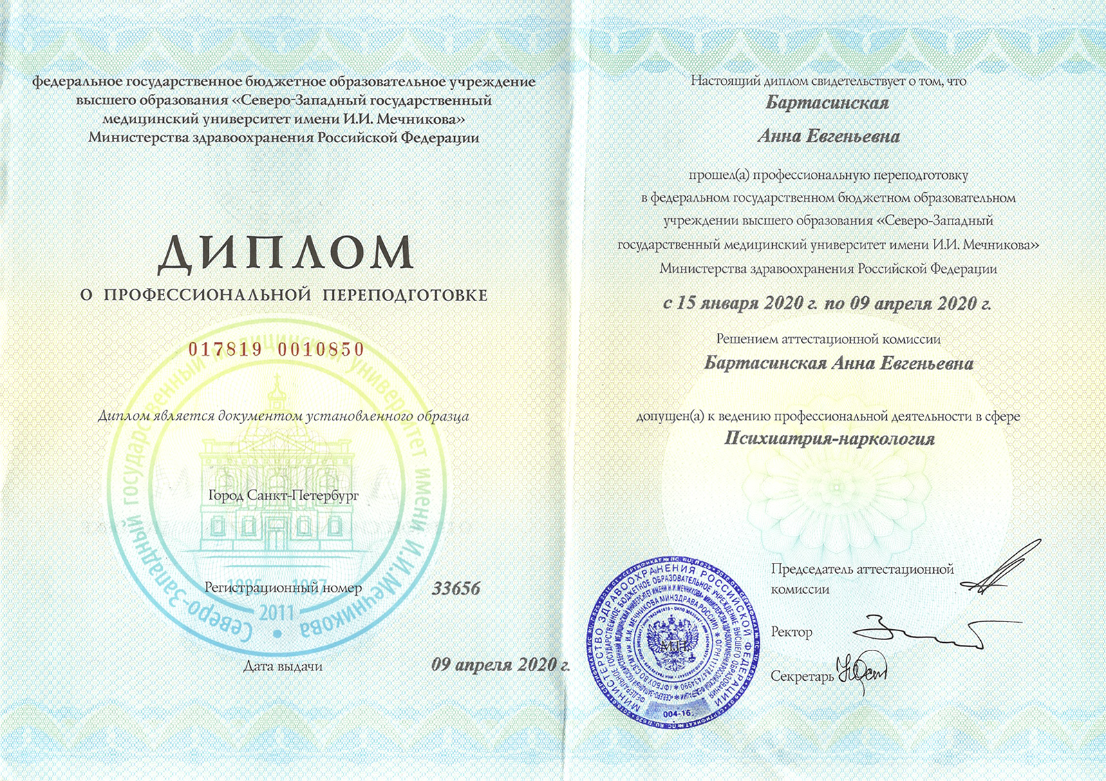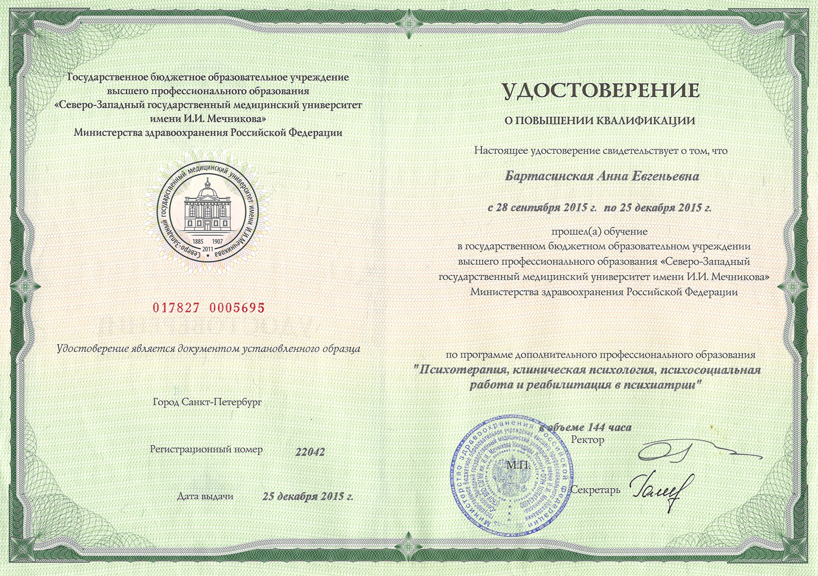Бартасинская Анна Евгеньевна уделяет внимание психообразованию пациентов, подробно разъясняет особенности заболевания, этапы и прогноз терапии. Считает важным формирование у пациента осознанного отношения к терапии и соблюдение рекомендаций специалиста. Регулярно повышает квалификацию, участвует в профессиональных конференциях, семинарах и обучающих программах, совершенствуя свои знания в области психиатрии смежных дисциплин.