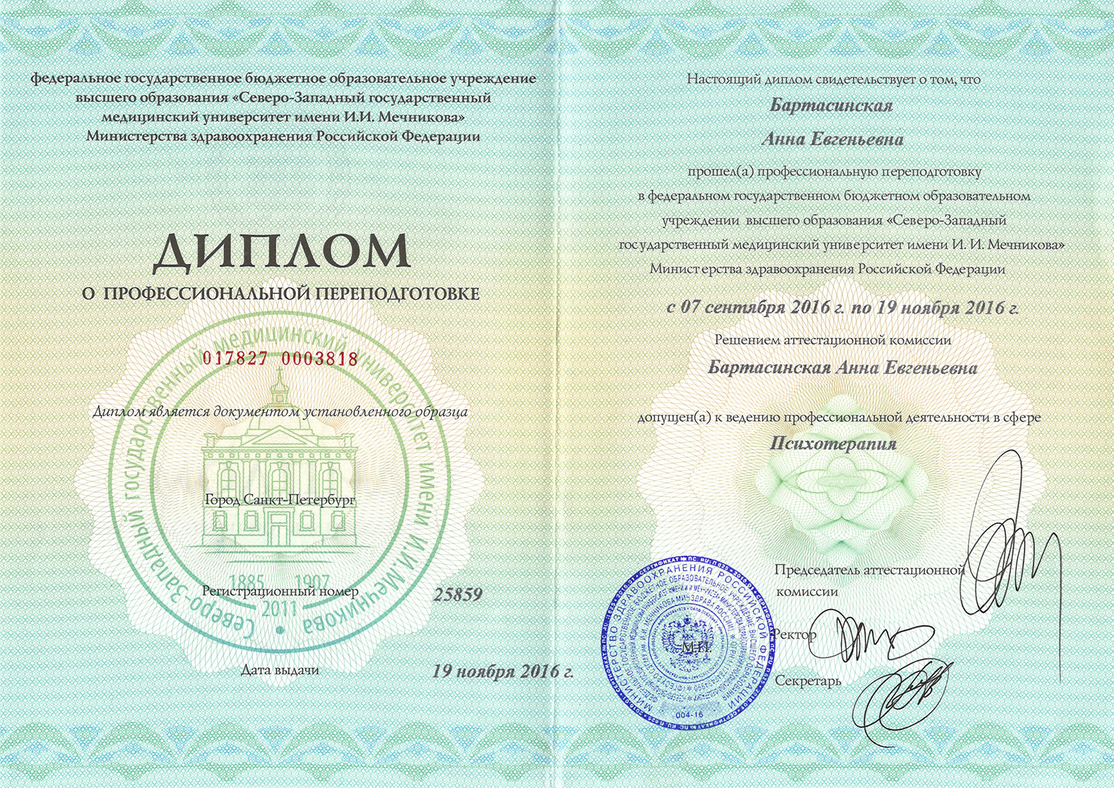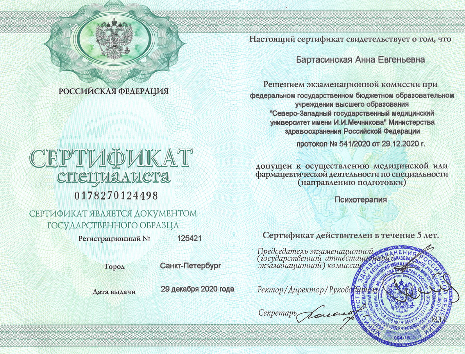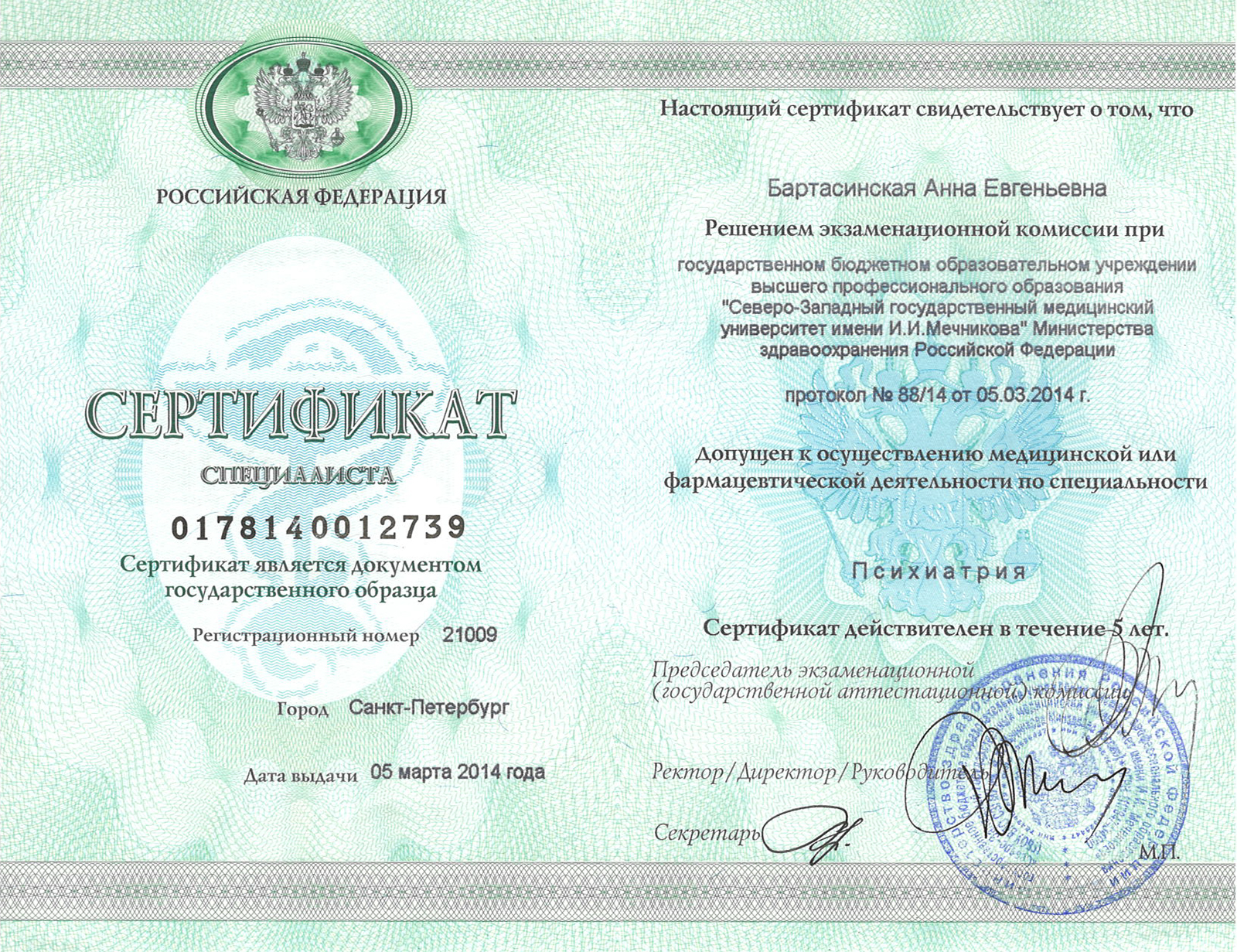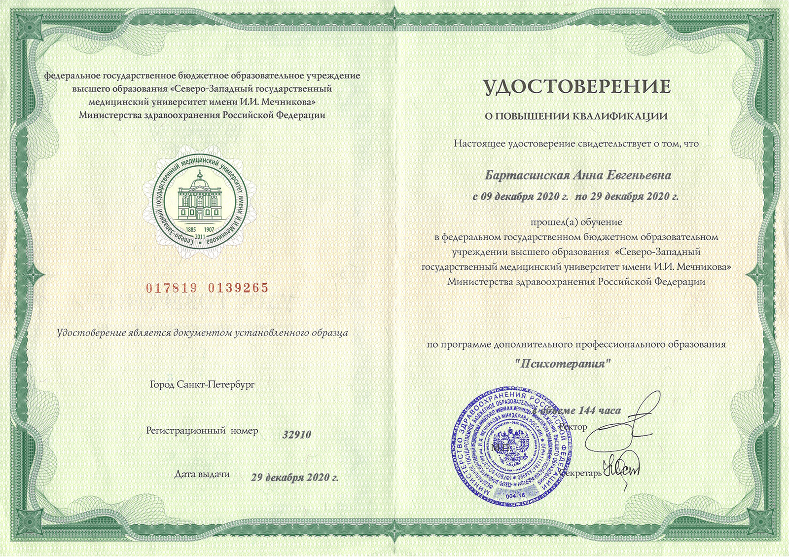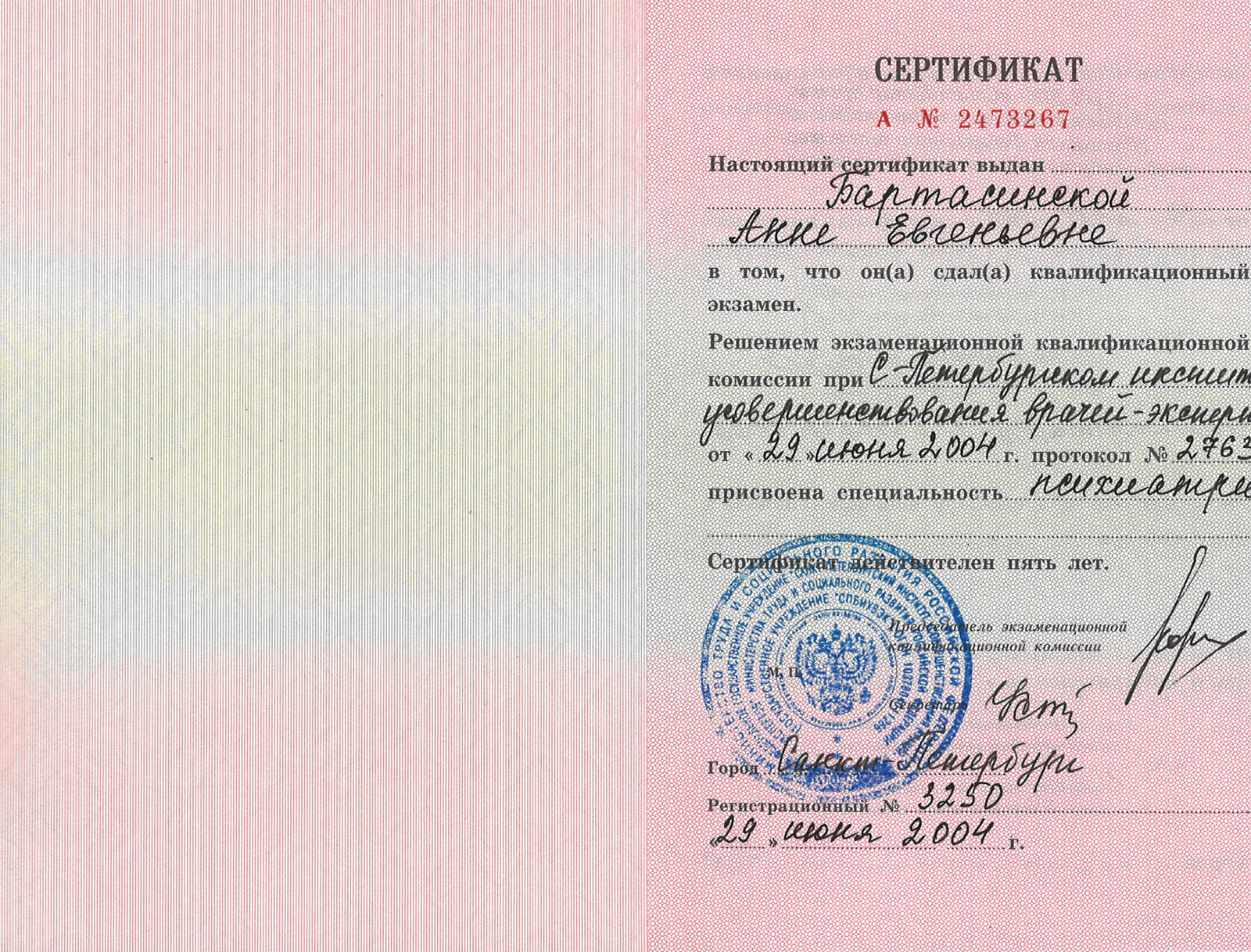 Бартасинская Анна Евгеньевна уделяет внимание психообразованию пациентов, подробно разъясняет особенности заболевания, этапы и прогноз терапии. Считает важным формирование у пациента осознанного отношения к терапии и соблюдение рекомендаций специалиста. Регулярно повышает квалификацию, участвует в профессиональных конференциях, семинарах и обучающих программах, совершенствуя свои знания в области психиатрии смежных дисциплин.