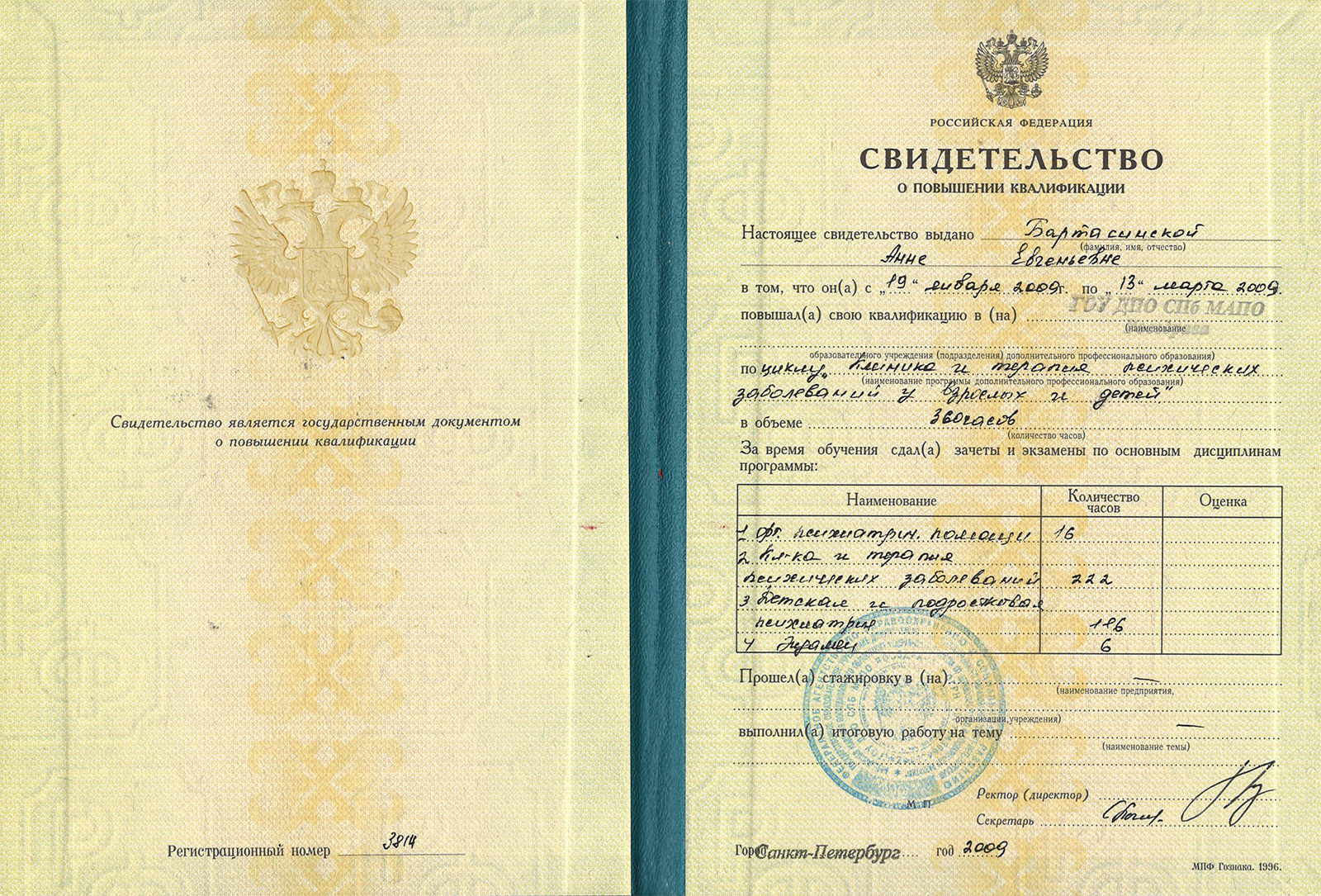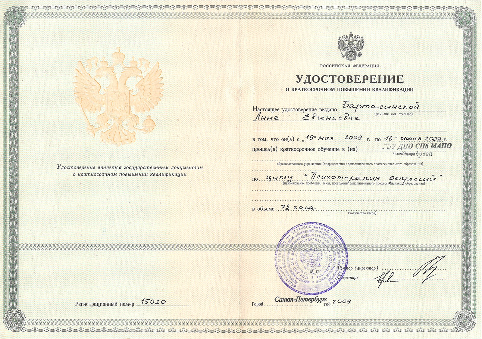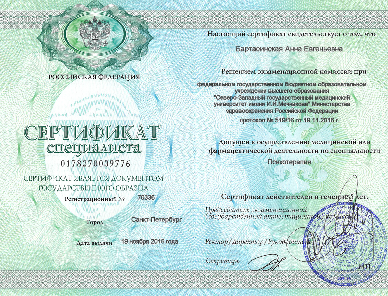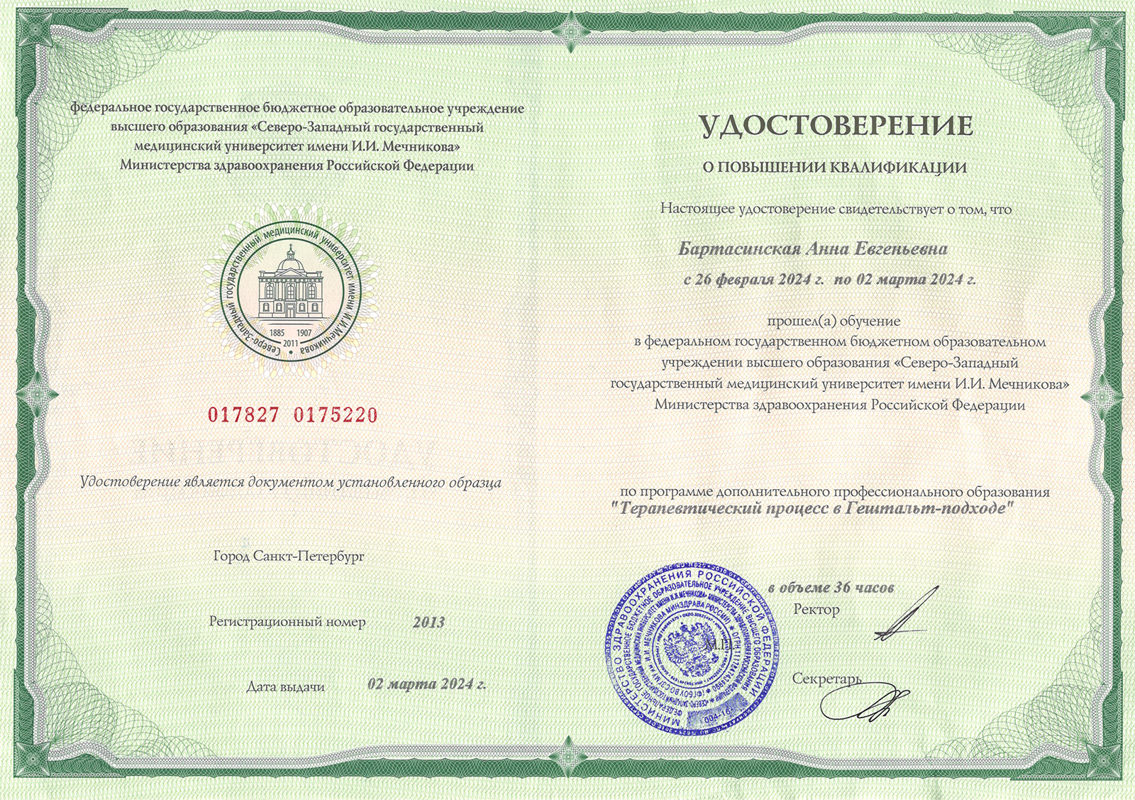 Бартасинская Анна Евгеньевна уделяет внимание психообразованию пациентов, подробно разъясняет особенности заболевания, этапы и прогноз терапии. Считает важным формирование у пациента осознанного отношения к терапии и соблюдение рекомендаций специалиста. Регулярно повышает квалификацию, участвует в профессиональных конференциях, семинарах и обучающих программах, совершенствуя свои знания в области психиатрии смежных дисциплин.