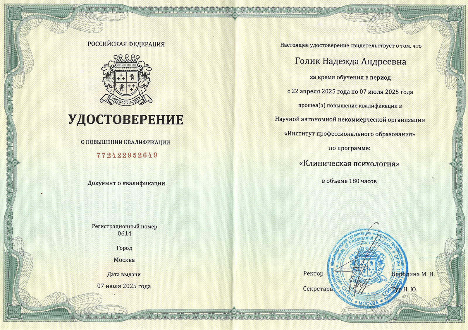 Голик Надежда Андреевна специализируется на проведении экспериментально-психологического обследования (ЭПО, психодиагностика), направленного на определение актуального психологического статуса пациента. ЭПО включает в себя исследование познавательной сферы, которое раскрывает протекание психических процессов: восприятие, внимание, память, мышление. Это исследование позволяет оценить сохранность эмоционально-личностной сферы.