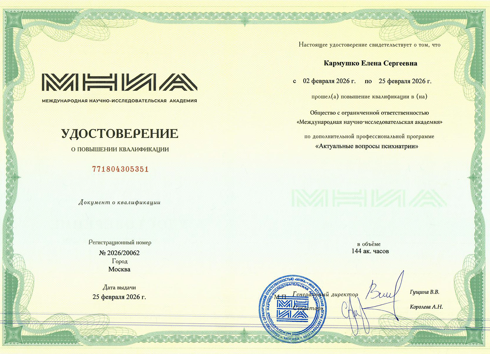 Кармушко Елена Сергеевна ведет амбулаторный прием пациентов с невротическими, психотическими и пограничными расстройствами психики. Специализируется на подборе психофармакотерапии, учитывает анамнез пациента, индивидуальные особенности течения заболевания, эффективность и переносимость предыдущего лечения. Контролирует динамику состояния, отслеживает результативность терапии, при необходимости корректирует назначения, что способствует достижению устойчивой ремиссии и снижению риска рецидивов.
