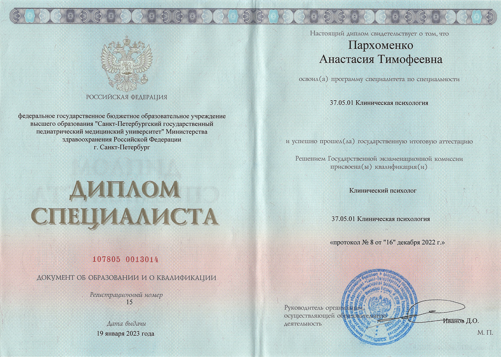 Пархоменко Анастасия Тимофеевна проводит групповые психообразовательные, психокоррекционные и психотерапевтические занятия с пациентами стационара клиники, направленные на снятие психоэмоционального напряжения и повышение стрессоустойчивости. Имеет опыт работы в психиатрических отделениях и владеет современными методами психологической диагностики и коррекции.